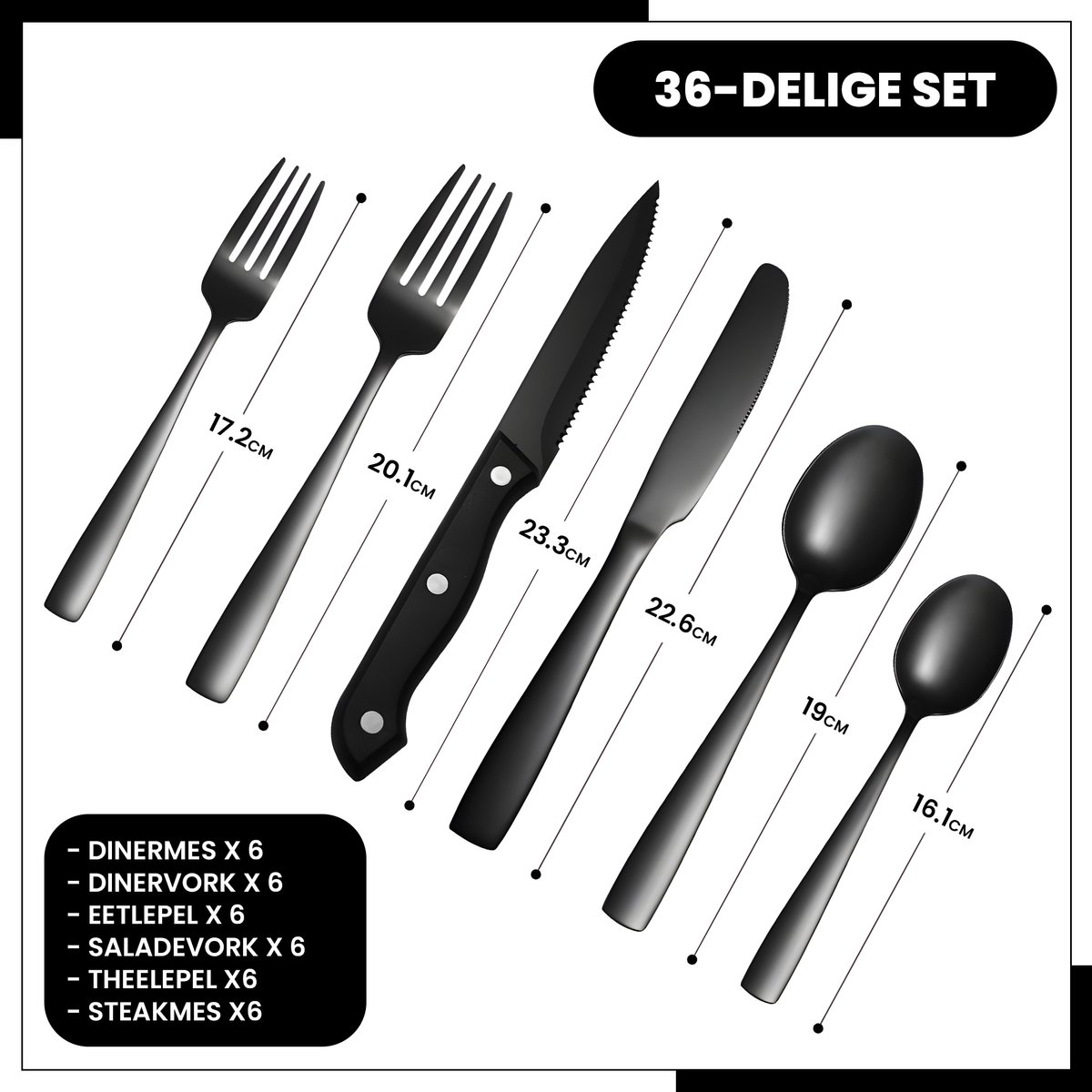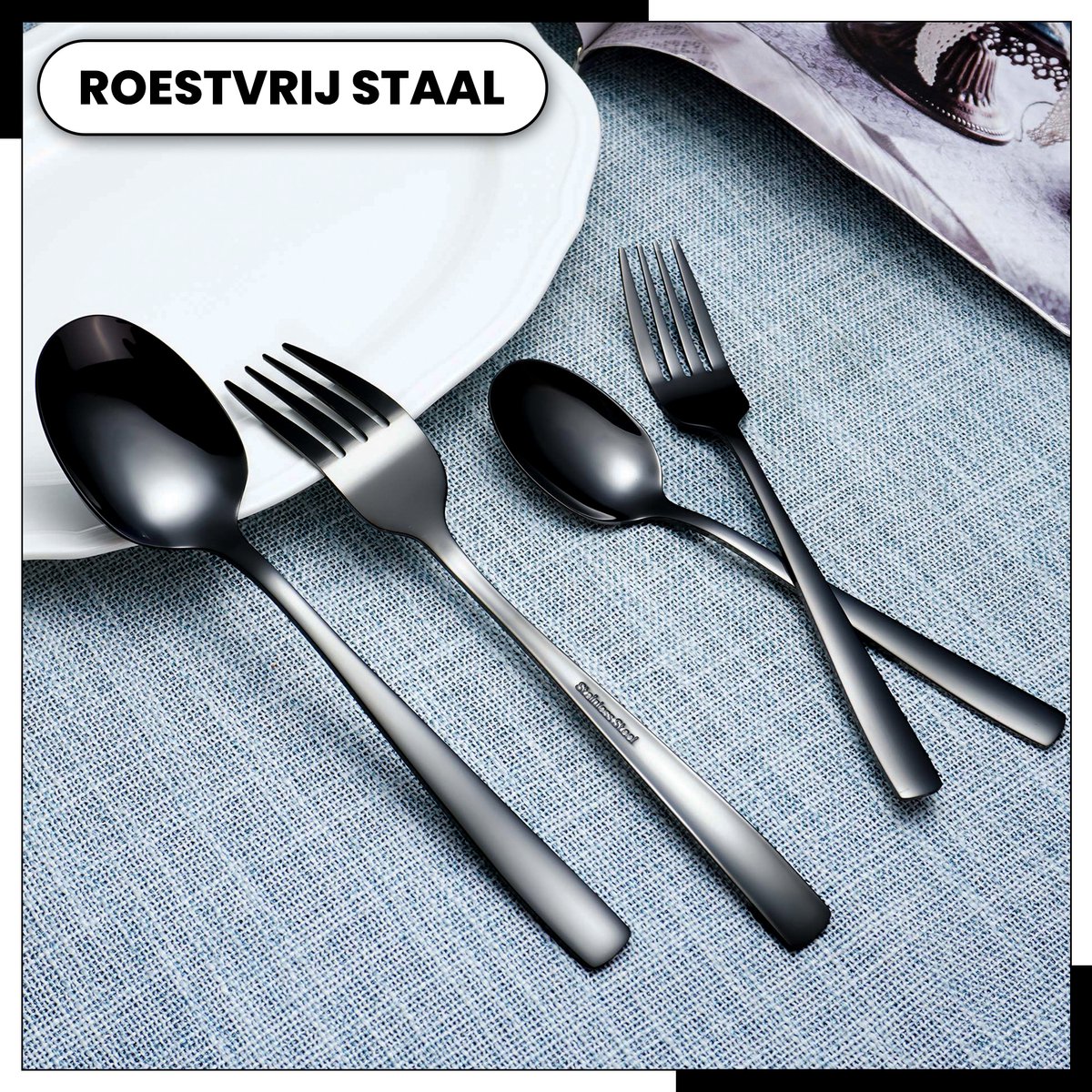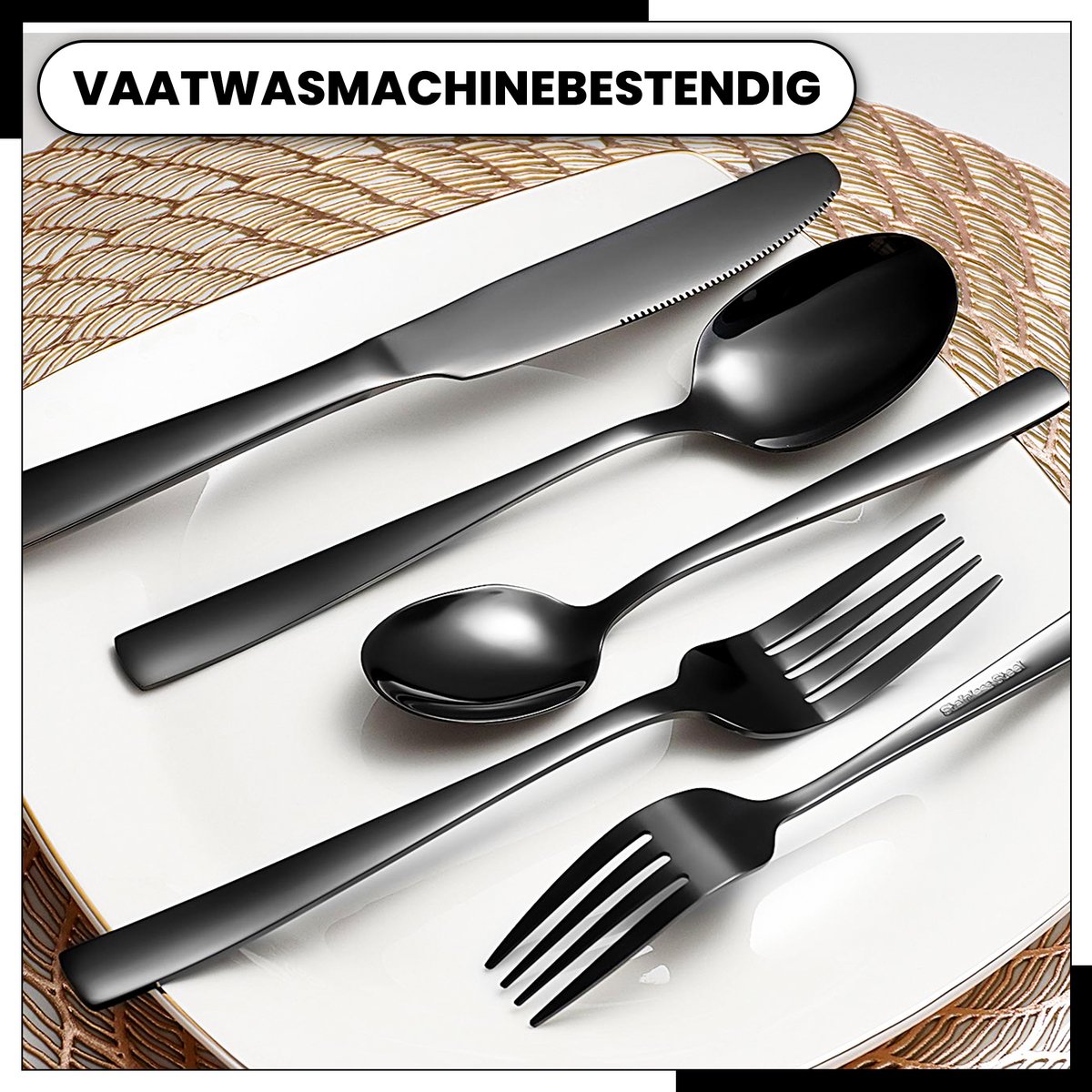 Dankzij het strakke, moderne zwart design voegt deze bestekset een eigentijdse touch toe aan elke tafel. Gemaakt van hoogwaardig roestvrij staal, garandeert elk stuk niet alleen een tijdloze uitstraling, maar ook een enorme slijtvastheid en vaatwasbestendigheid. Dit betekent dat je na een gezellige maaltijd eenvoudig kunt schoonmaken zonder zorgen, terwijl je blijft genieten van een elegante uitstraling.