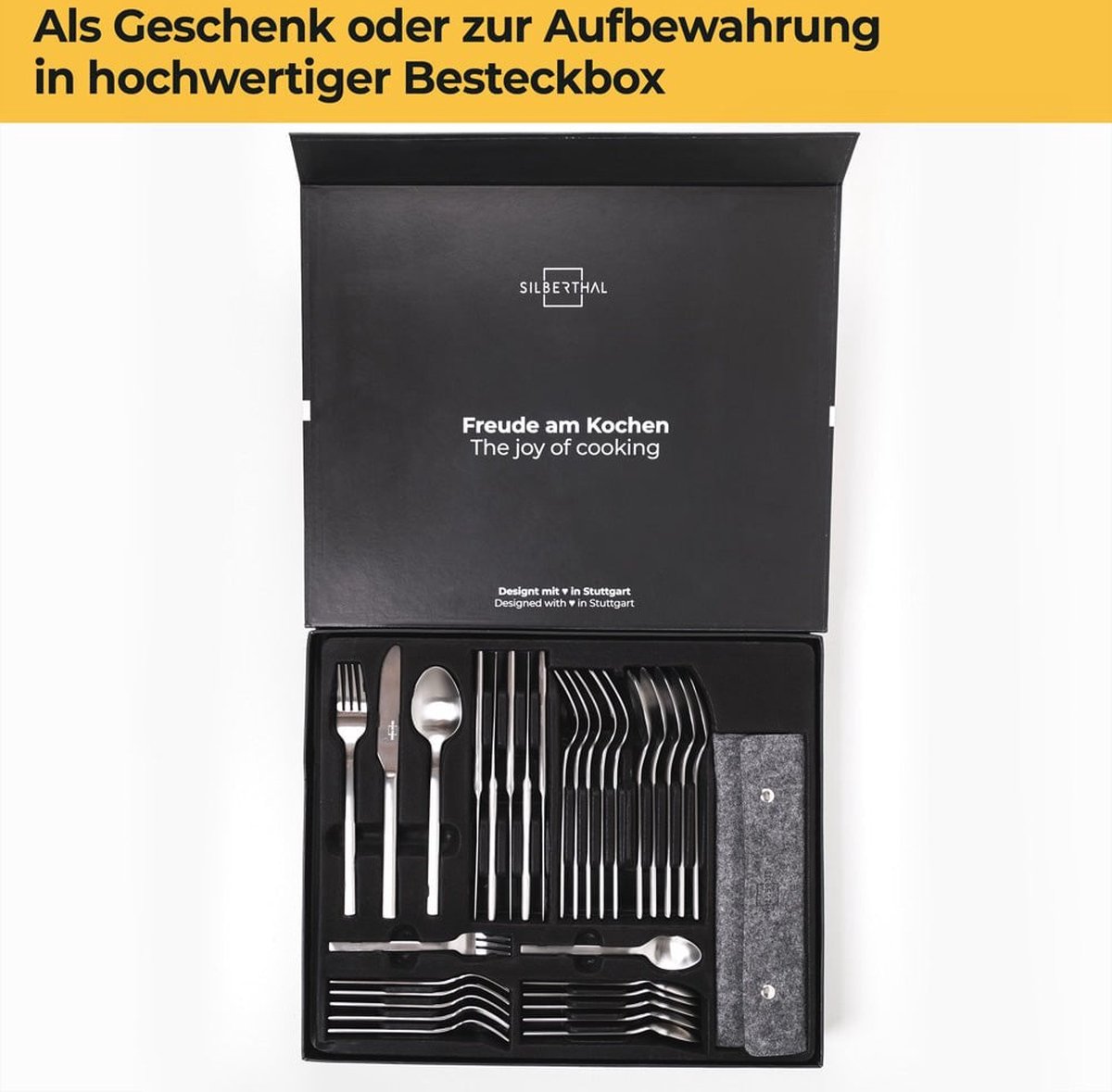 De set maakt het mogelijk om voor elk gerecht het juiste bestek bij de hand te hebben, of u nu thuis dineert, gasten ontvangt of op een picknick bent. Het scrollt in een elegante zwarte doos, perfect als cadeau voor speciale gelegenheden of als aanvulling op uw huidige servies. Ook wordt een certificaat-waardige vilten bestekkoffer meegeleverd, zodat u het bestek gemakkelijk meeneemt en beschermt tijdens reizen.