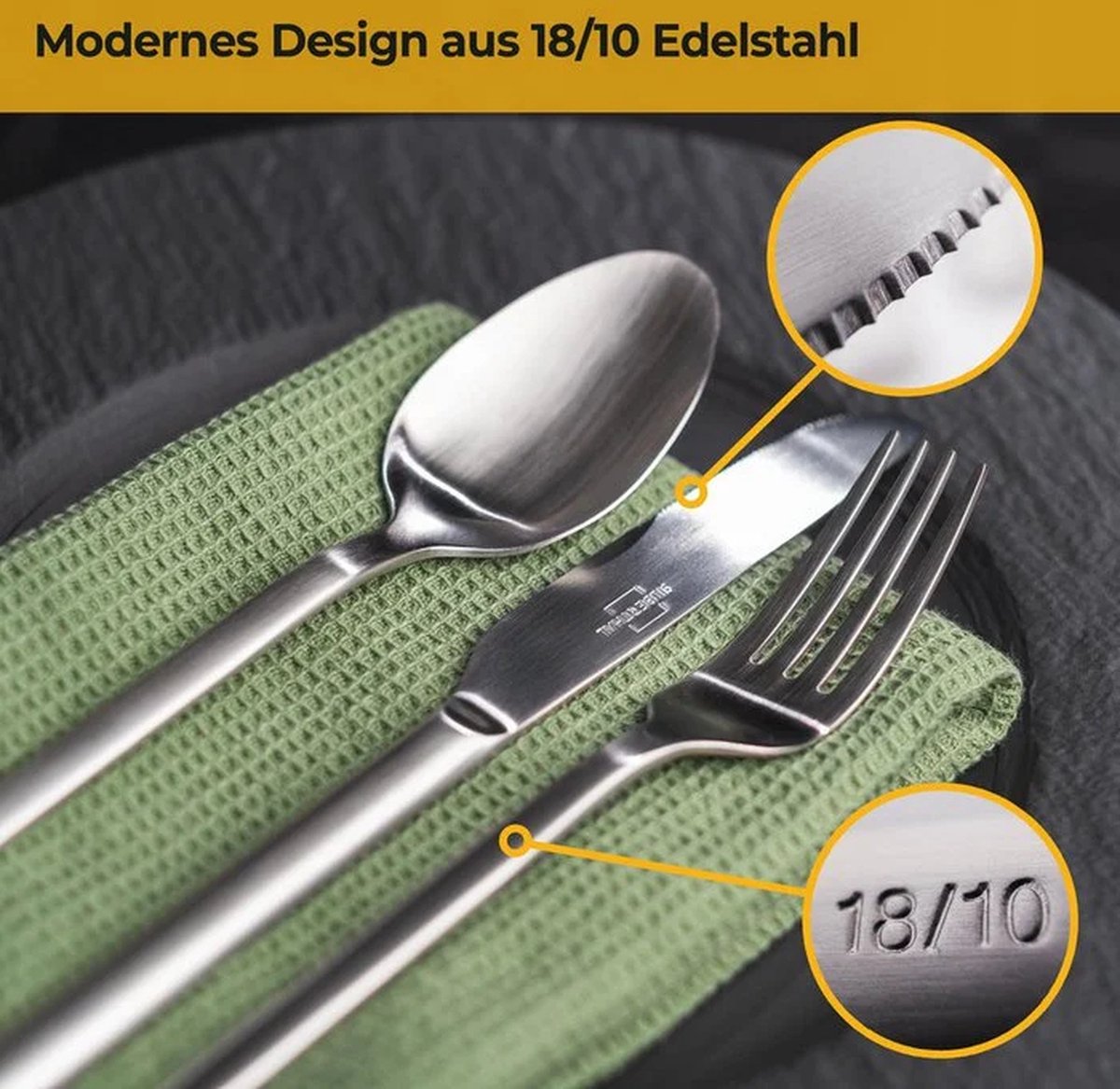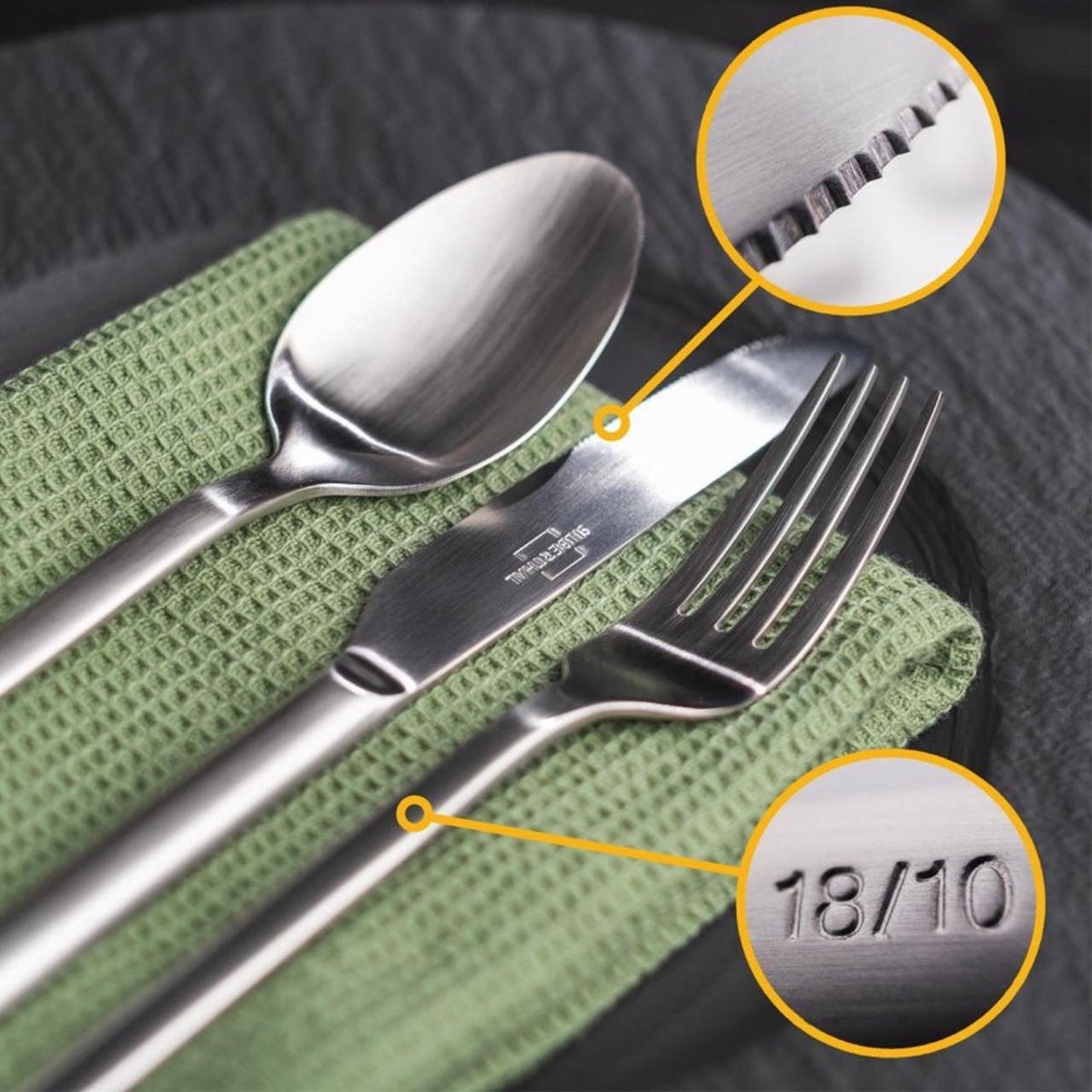 Gemaakt van 18/10 roestvrijstaal, staat deze bestekset garant voor duurzaamheid en een lange levensduur. Het materiaal is krasbestendig, roestvrij en vaatwasmachinebestendig, waardoor het gemakkelijk schoon te maken is en lang mooi blijft. De messen zijn vervaardigd uit hoogwaardig lemmetstaal (420) en beschikken over een handgeslepen kartelrand, wat zorgt voor een uitstekende snijprestatie en langdurige scherpte. Dankzij de robuuste, één-stuk constructie buigt het bestek niet door en blijft het stevig in gebruik.